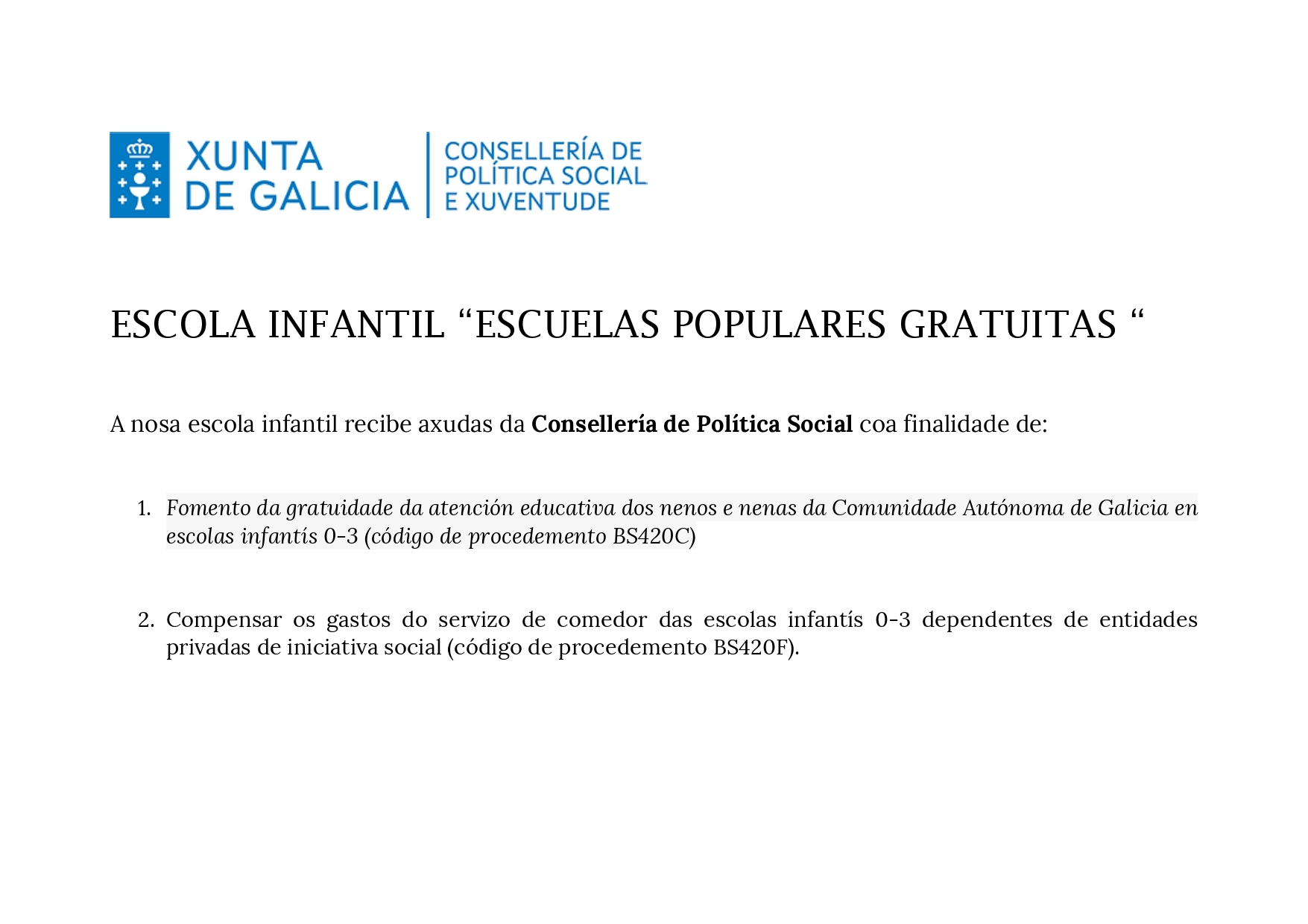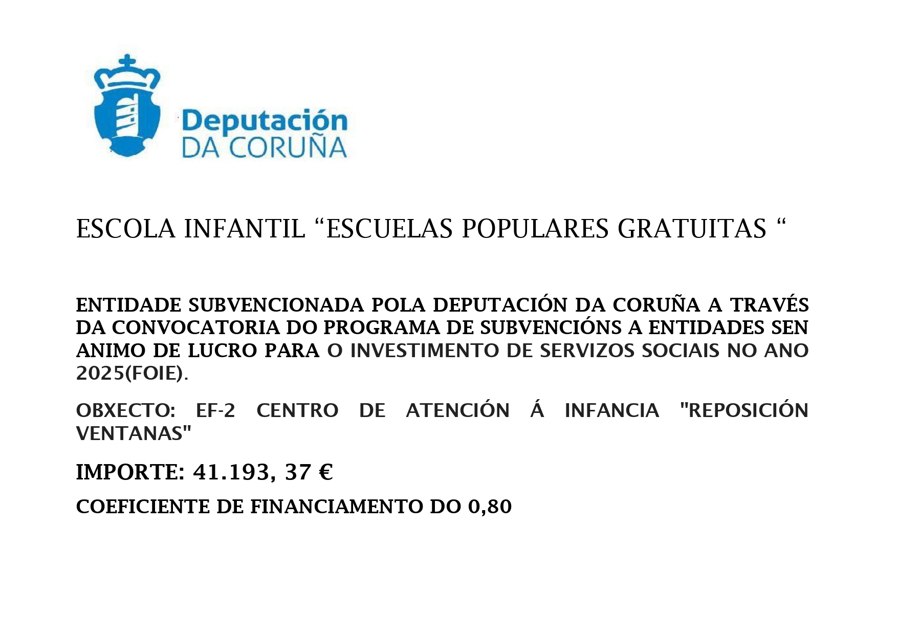 Las Escuelas Populares Gratuitas perciben subvenciones de la Xunta de Galicia, de la Excma. Diputación Provincial de La Coruña y fondos FEDER de la Unión Europea, además de aportaciones desinteresadas de los socios benefactores